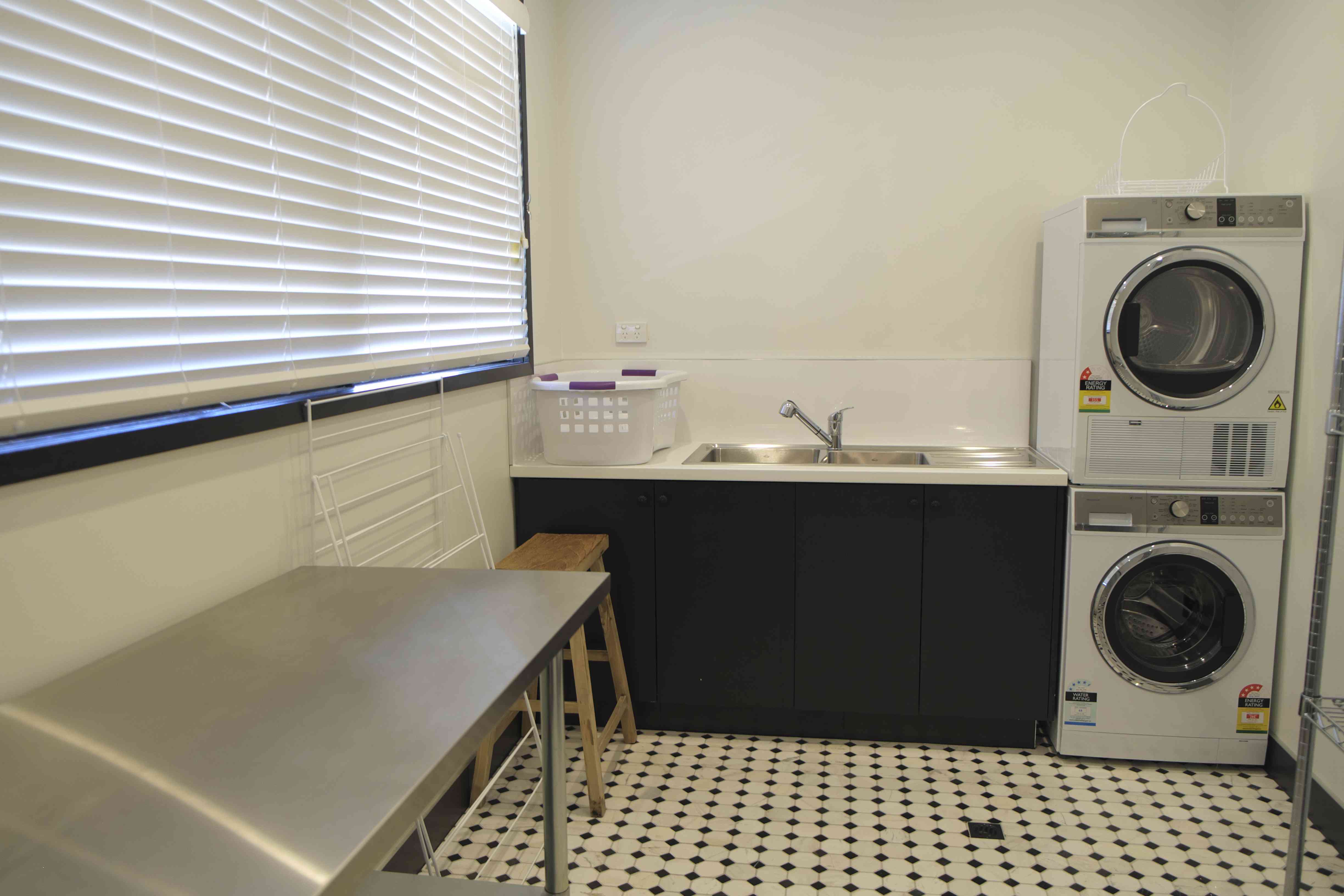 - Front loader (soap powder provided) and condensor dryer, no clothes line